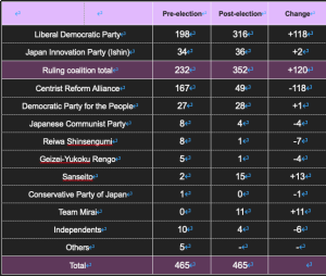 In addition, the LDP ran too few candidates on the proportional representation lists, resulting in a total of 14 seats being forfeited to other parties. Coalition partner Nippon Ishin no Kai also increased from 34 to 36 seats, bringing the ruling bloc to 352 seats (76% of the total).
